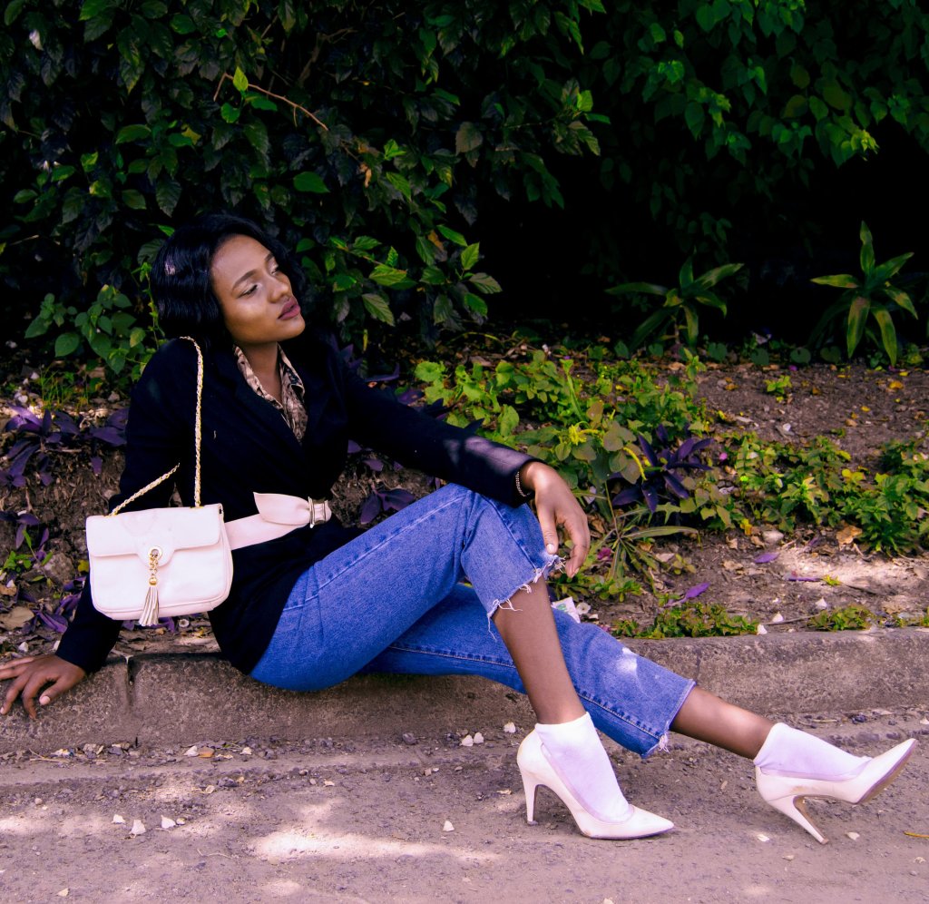 So i paired my blazer with baggy mom jeans (They are biiiiig😂 . You’ll see just how big they are on one of the blogs ), the heels socks combination and a white sling bag.